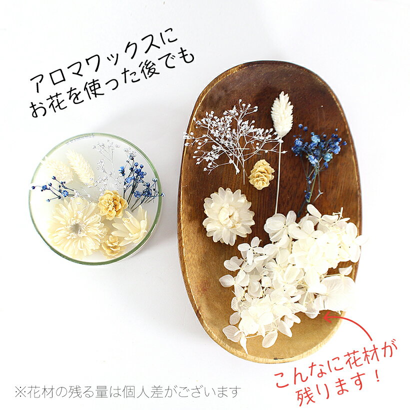 キット内容 ・ワックス 50g ・シャーレ 1個 ・帯 ・花材 ・作り方説明書 ※アロマオイルは付属していません 花材内訳 ・ソフトミニかすみ草(シルバー) ・ポアプランツ(ホワイト) ・かすみ草(ブルー) ・ミニツガ(ホワイト) ・ヘリクリサム(ホワイト) ・紫陽花(ホワイト) ご注意事項 ※アロマオイル等を作品に浸透させる目的で使用される場合は、成分によっては浸透せず分離し容器の底に溜まるものがあります。