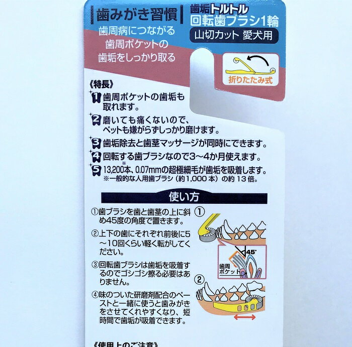 超小型犬・猫用 原材料:ポリカーボネート/ナイロン [使い方] 1)前歯から奥歯の部分にかけて歯ブラシを ブラシが回転するように磨いてください。