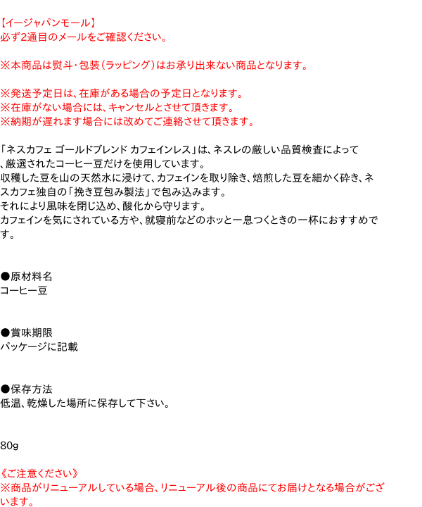 ネスレ ゴールドブレンドカフェインレス80g ×12個 はコチラ >>【イージャパンショッピングモール】内のみのお買い物は、送料一律でどれだけ買っても同梱する事が出来ます。
